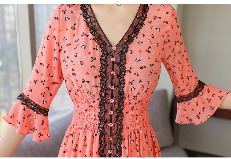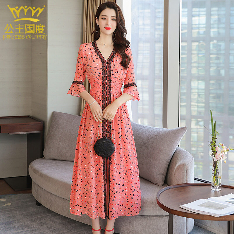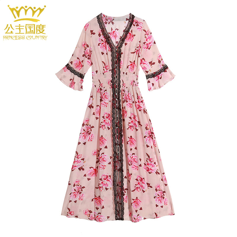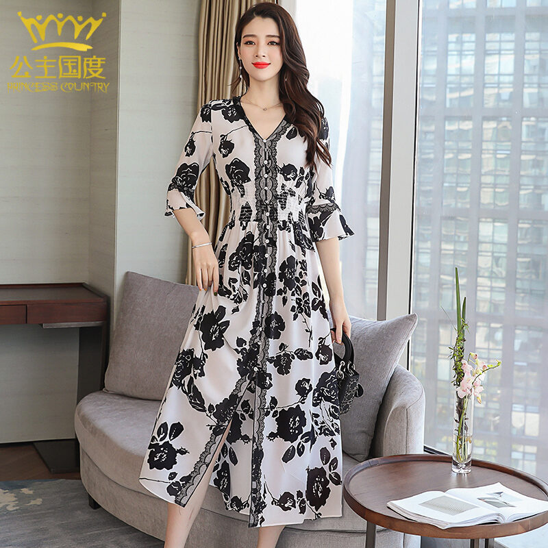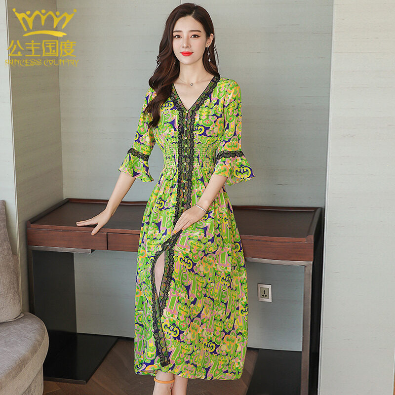 Princess Country Summer Lace Edge Elastic Waist Slim-Fit Heavy Silk Dress Pure Silk Women's Dress