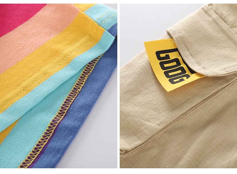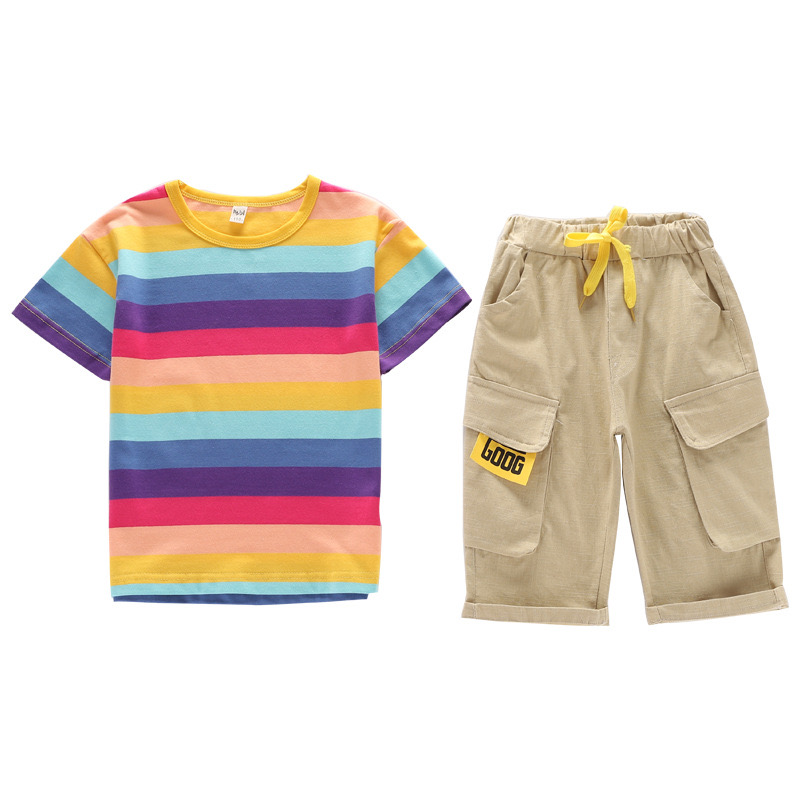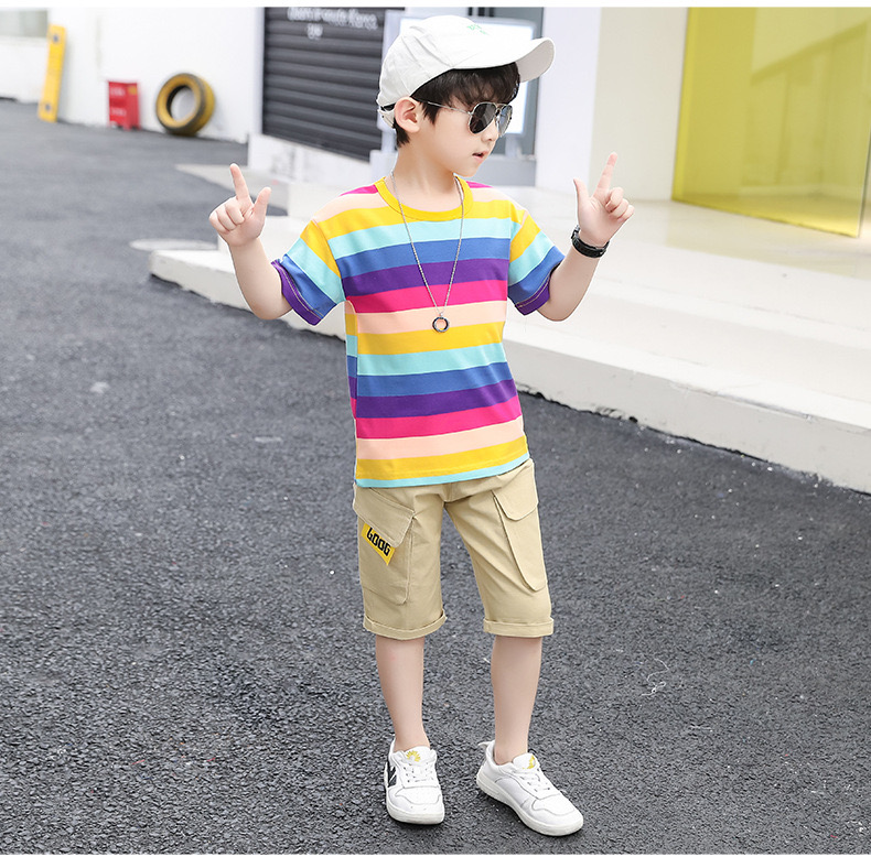 Children Short Sleeve Stripe Outfits 2Pcs Set Big Boys Kids Cotton T-shirt Tops + Short Pants Summer Casual Trendy Children's Clothes Set [S180]