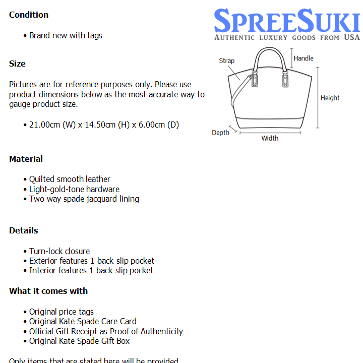 All our products are 100% authentic and purchased from Kate Spade stores in USA. We are a reputable registered business in Singapore and it is illegal to sell counterfeit goods in Singapore. This product also comes with a gift receipt which is printed by the Kate Spade store that we purchased the item from. It states the item that we purchased and the Kate Spade store that it was purchased from, proving the authenticity of the item. Buy with confidence.