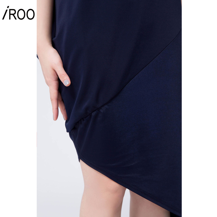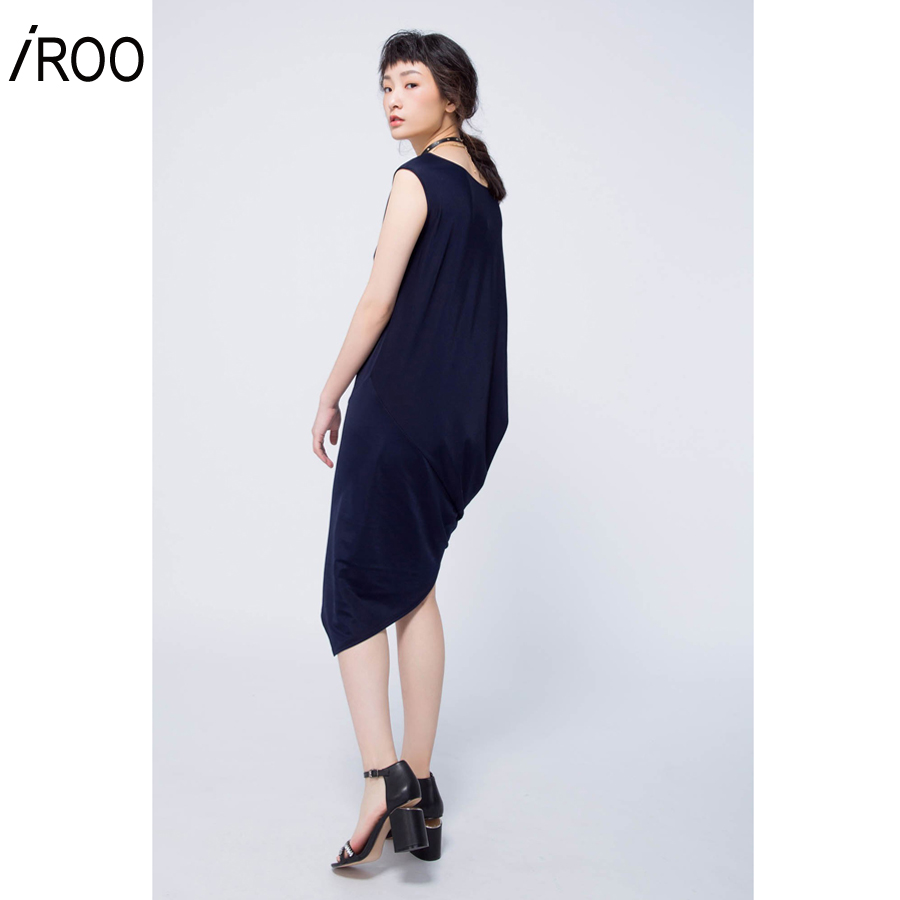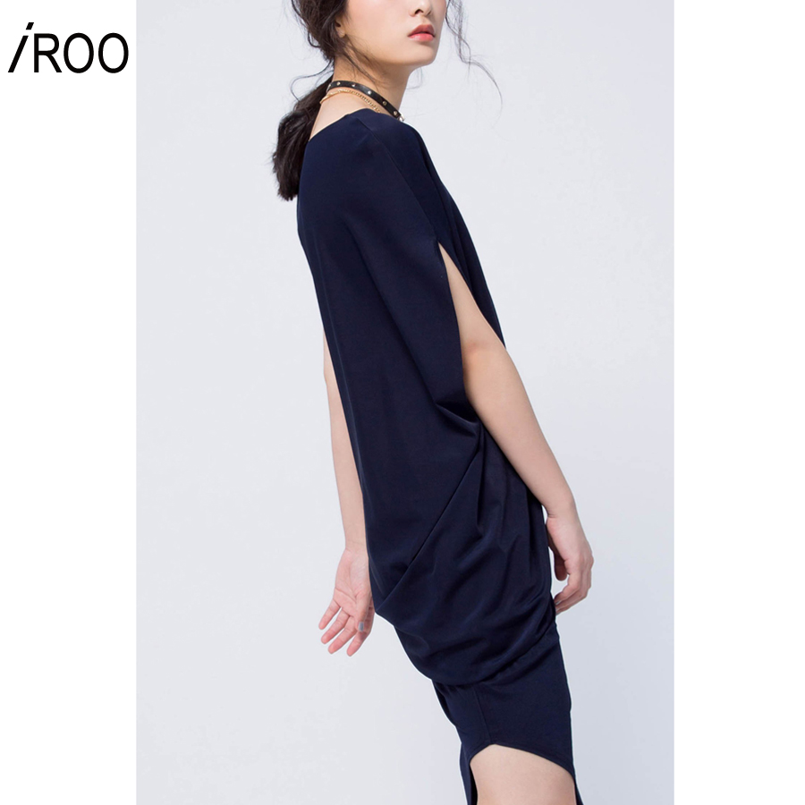 Straight neckline dress with asymmetric hemming, featuring gathered details at both sides