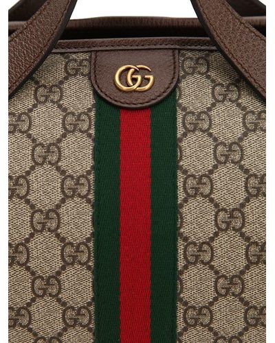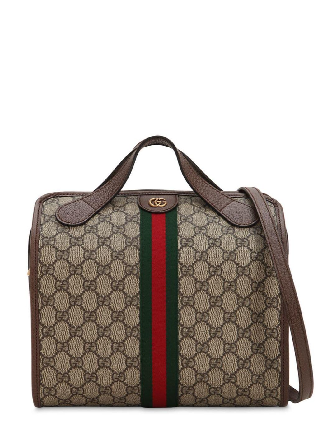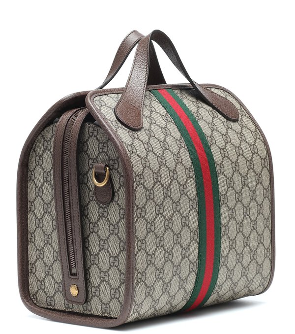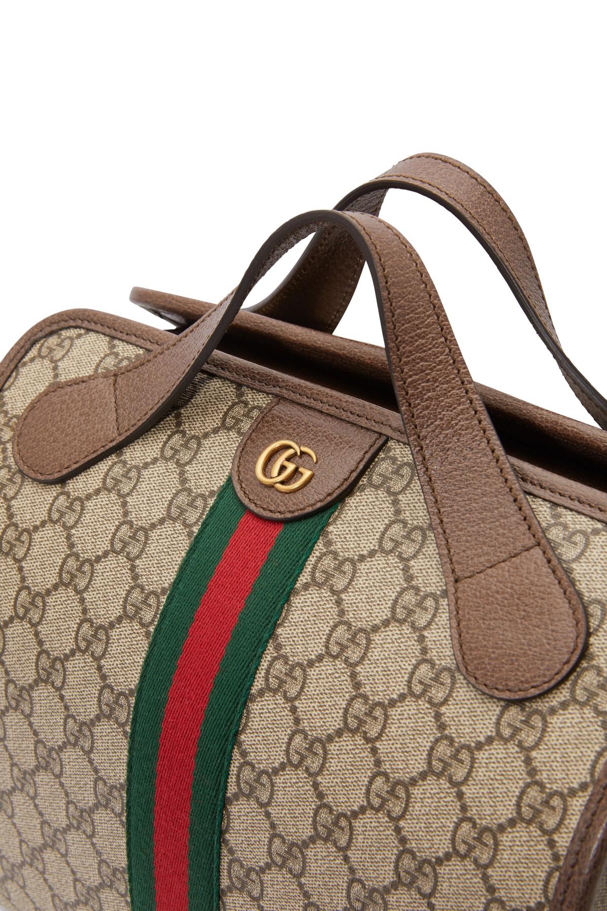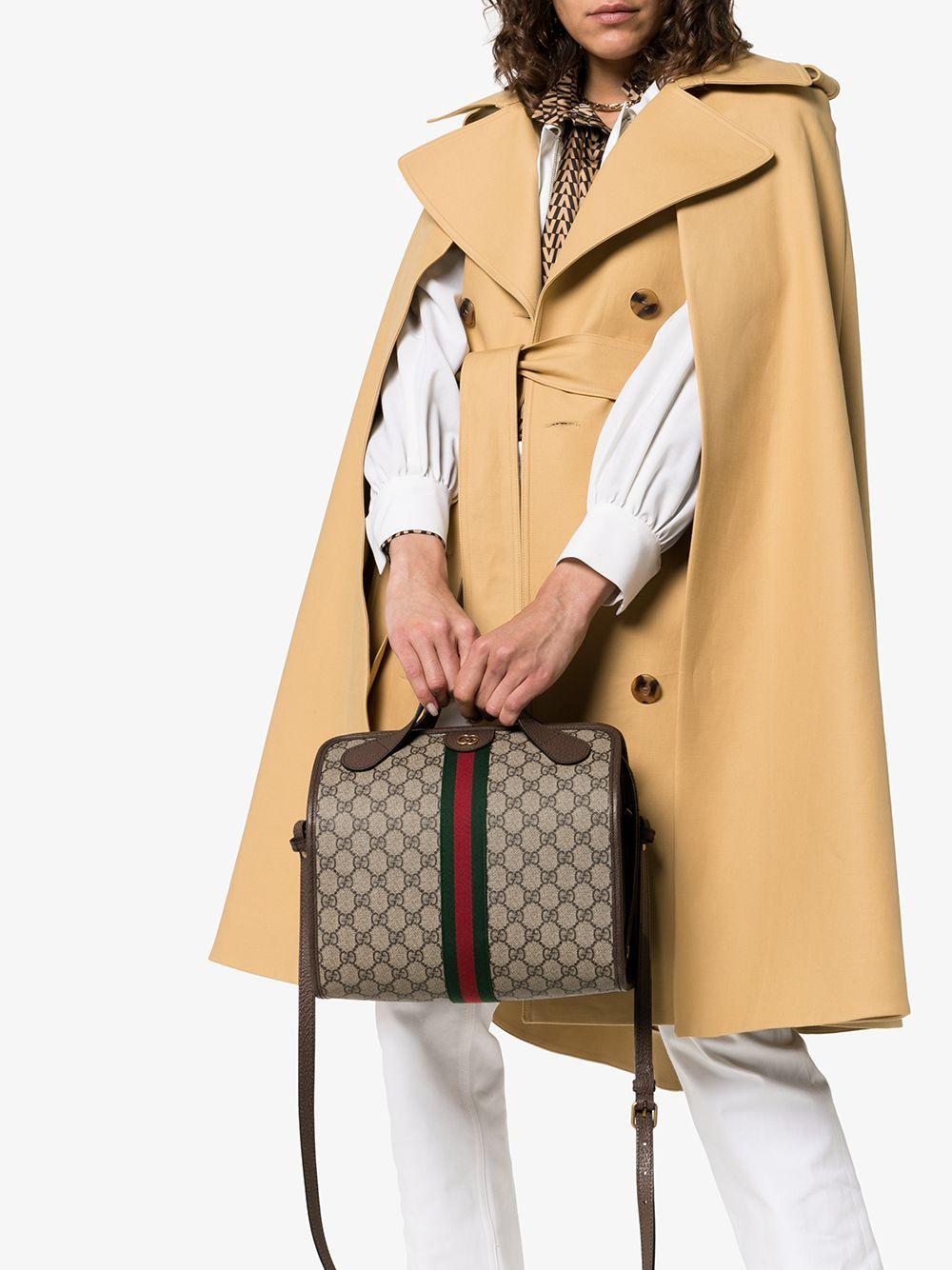 This beige and brown Gucci Supreme Ophidia mini duffle tote bag has been crafted with canvas in Italy. Fitted with top handles, this style features the signature web stripe, zip fastening, archive interlocking GG print, gold tone GG plaque and a detachable shoulder strap. You should never surround yourself with fakes or snakes. Fortunately, the Gucci Supreme Ophidia is a faux snake in the form of an authentic Italian handbag, so that's all good then.