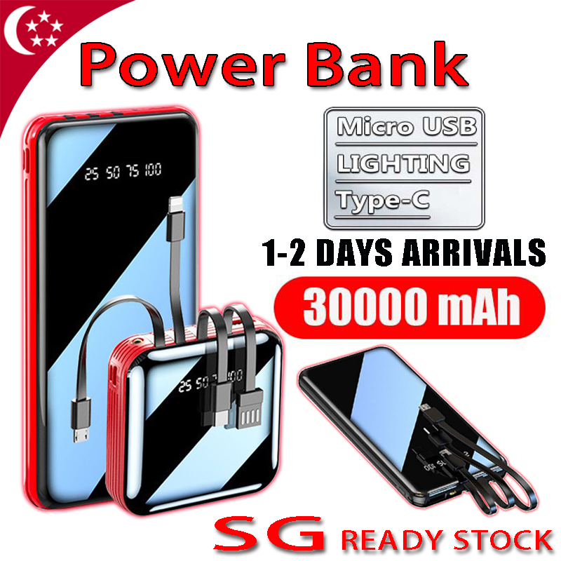 SG Ready Stock 30000mAh Mini Power Bank Dual USB Portable Fast Charging Digital Display Full Screen Built-in 3 Cables Powerbank External Battery