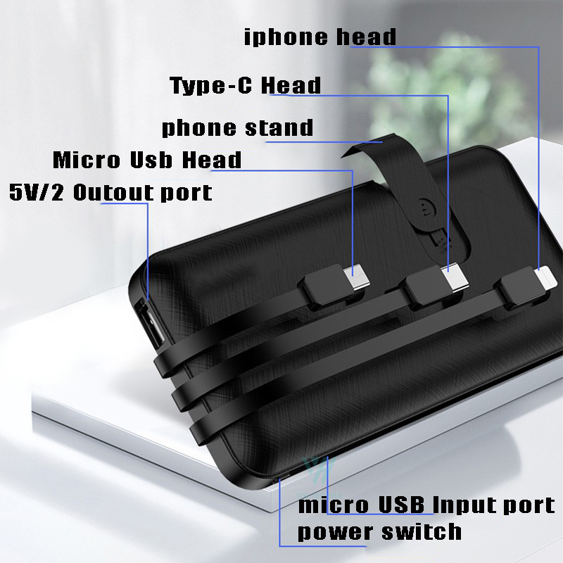 power bank built in three cable, one is for type C, one is for micro USB,