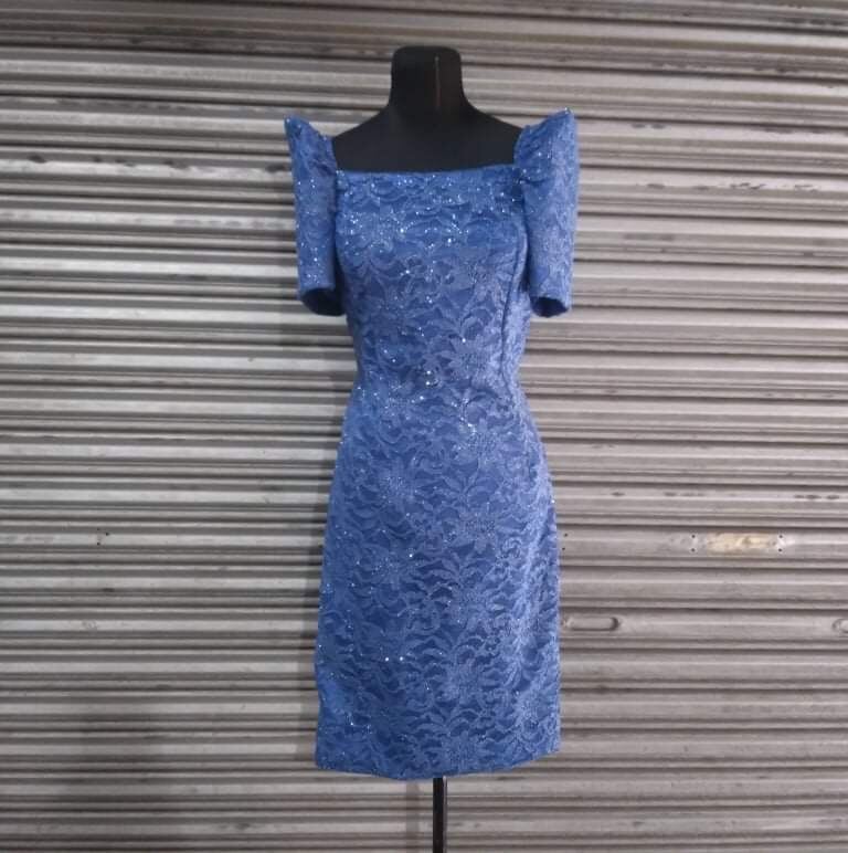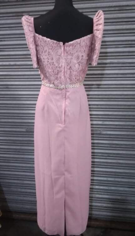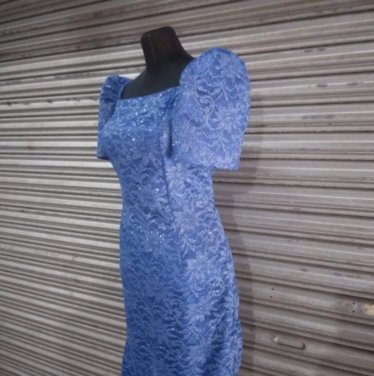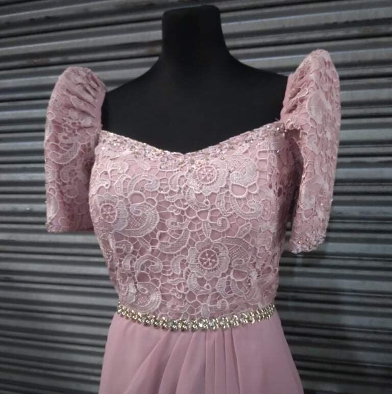 Midi dress is made from chanti lace. Full length dress is made from prada lace with chiffon skirt.