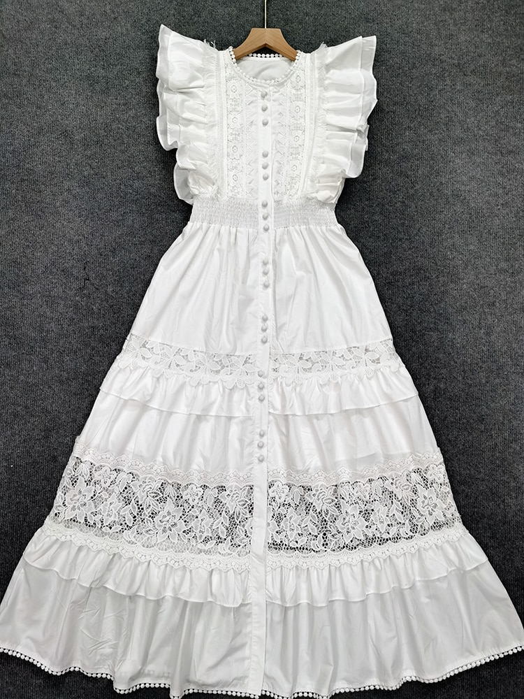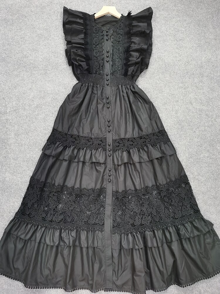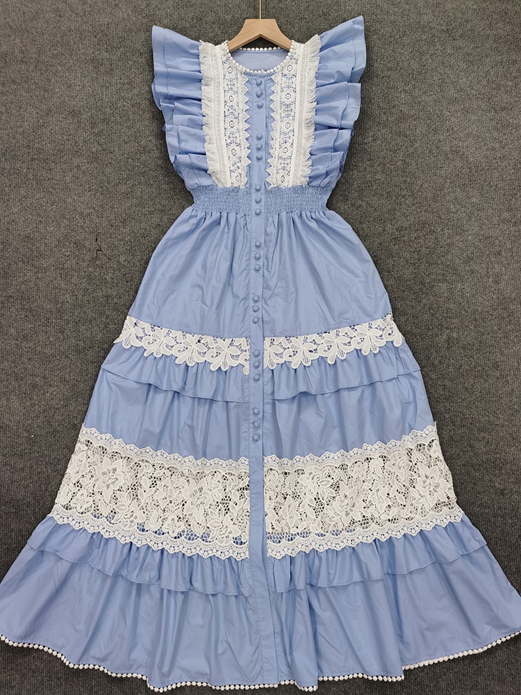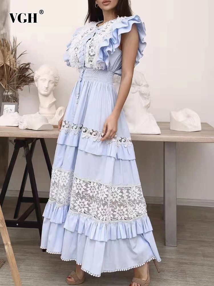 VGH Vintage Embroidery Tank Dress For Women Round Neck Sleeveless High Waist Patchwork Colorblock Loose Midi Dresses Female 2022