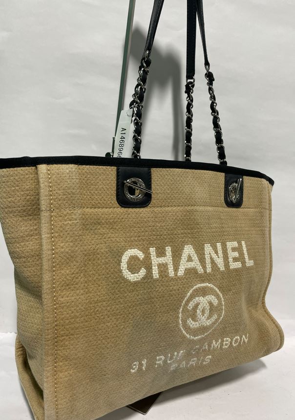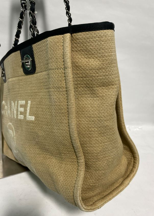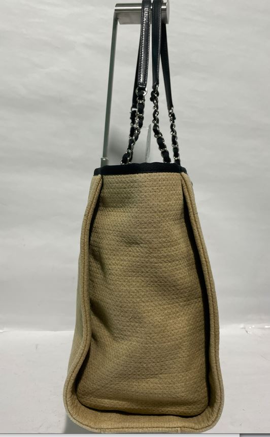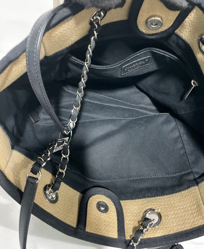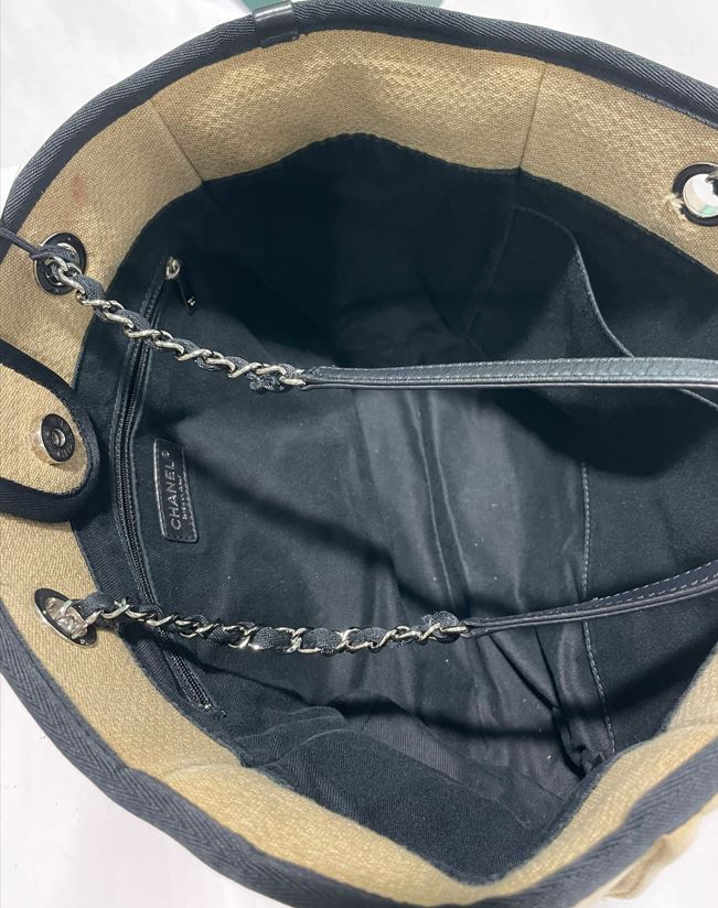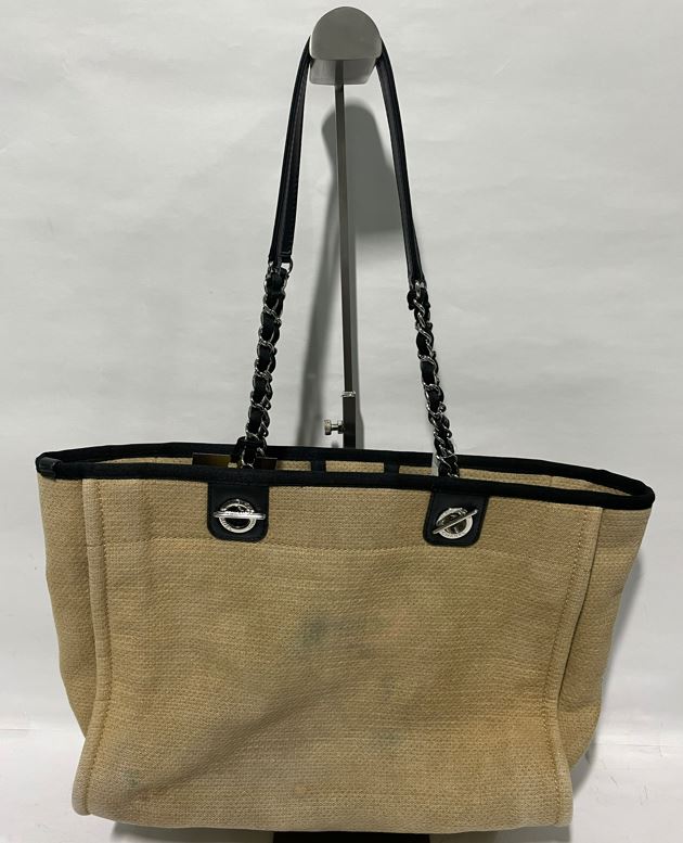 Silver-tone hardware with flat handles. Chain-link shoulder straps and canvas lining with dual interior pockets. Vintage piece.