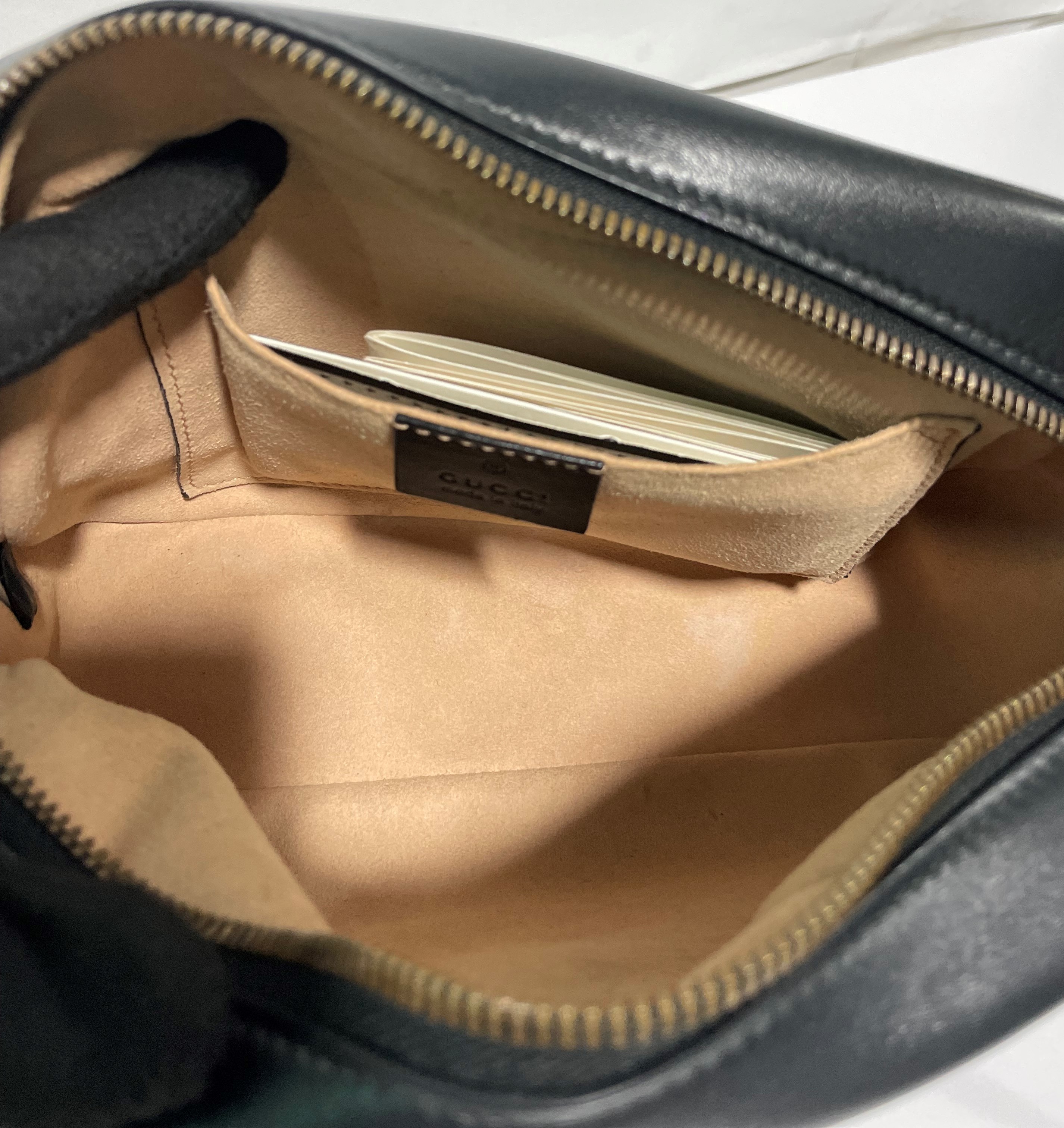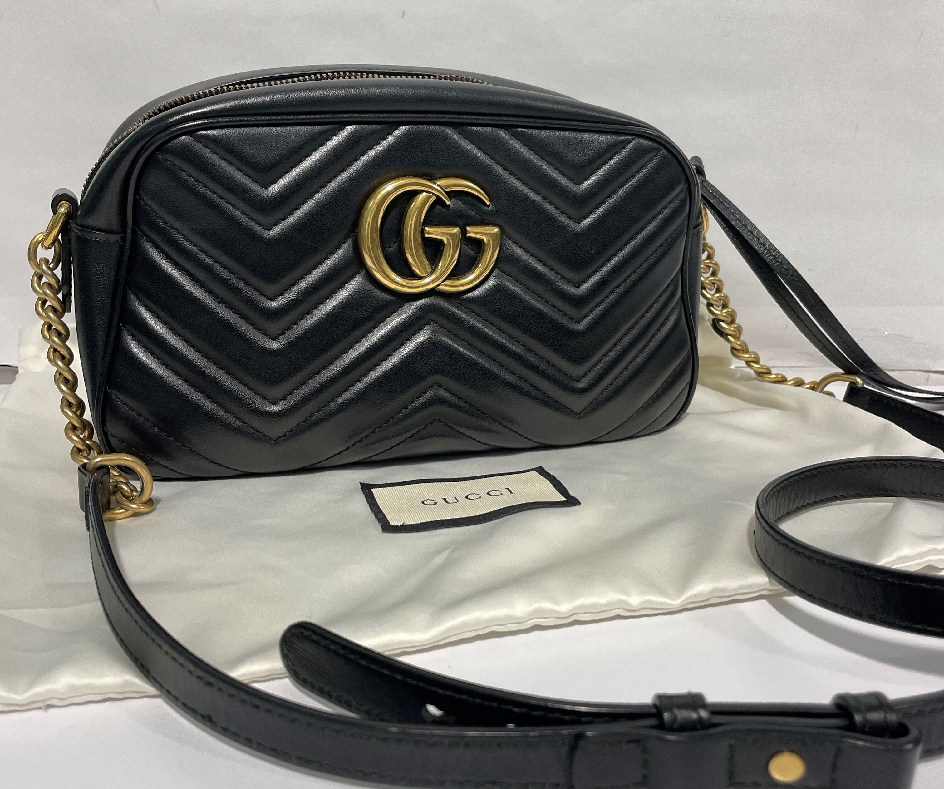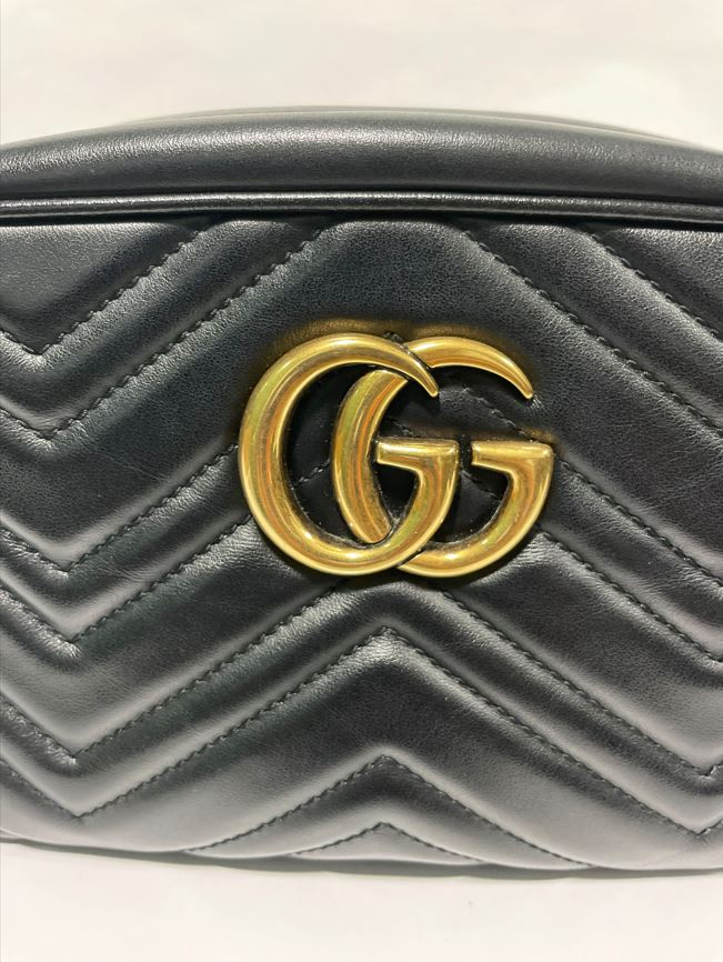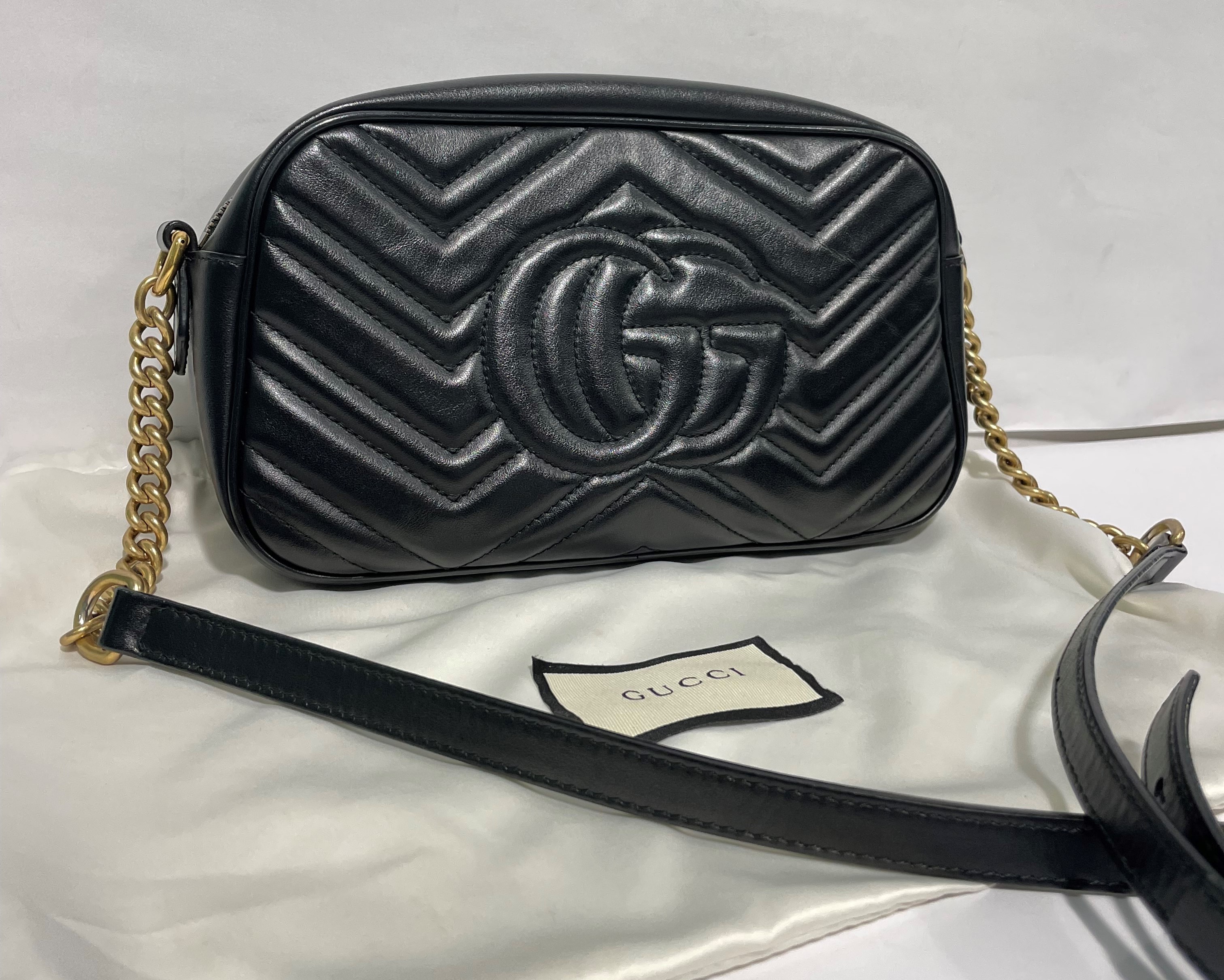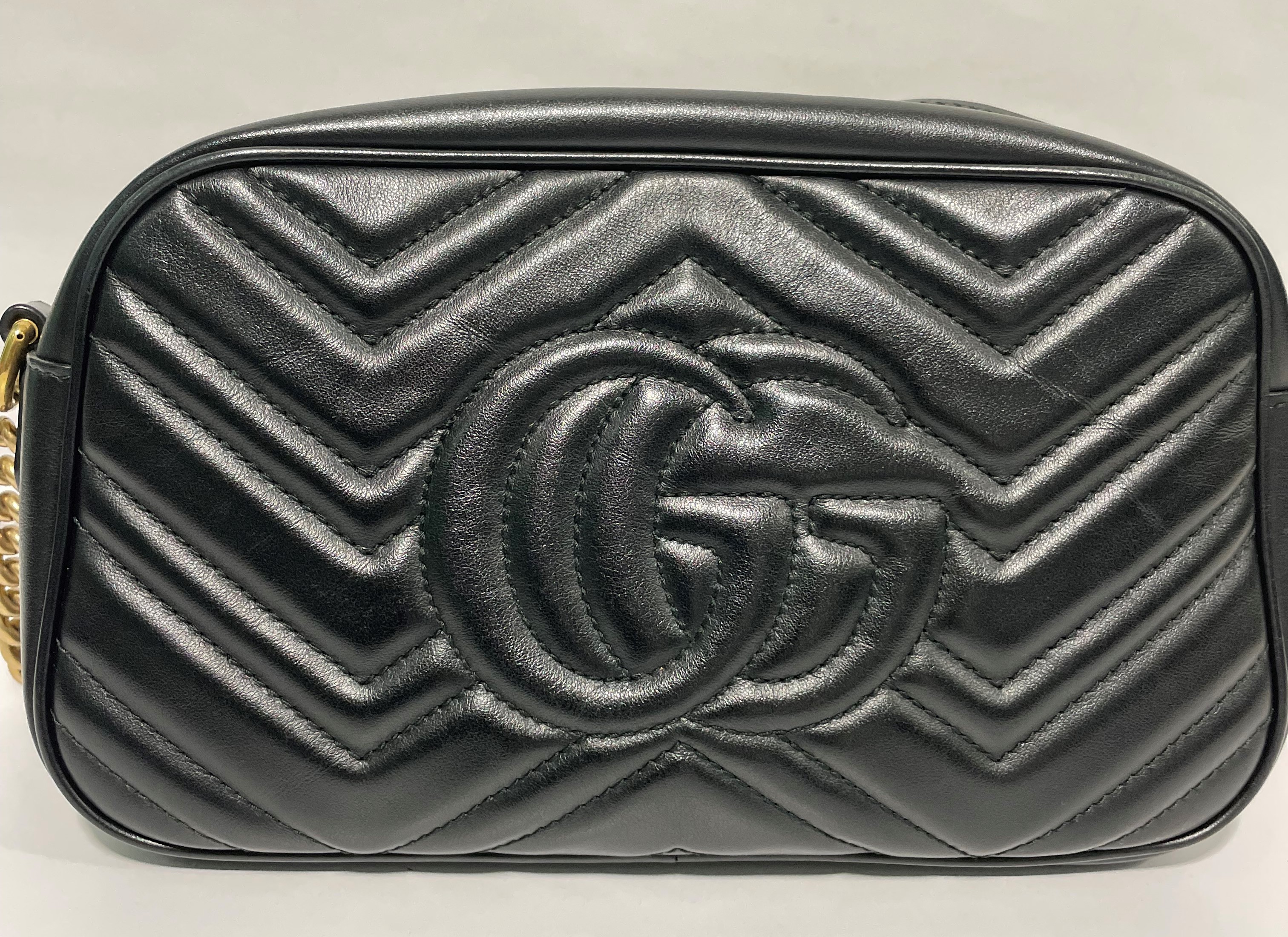 - Black matelasse chevron leather with GG on the back with antique gold-toned hardware and interior open pocket. Antique gold-toned hardware and Double G. Adjustable chain shoulder strap can be worn as a shoulder strap or cross body.